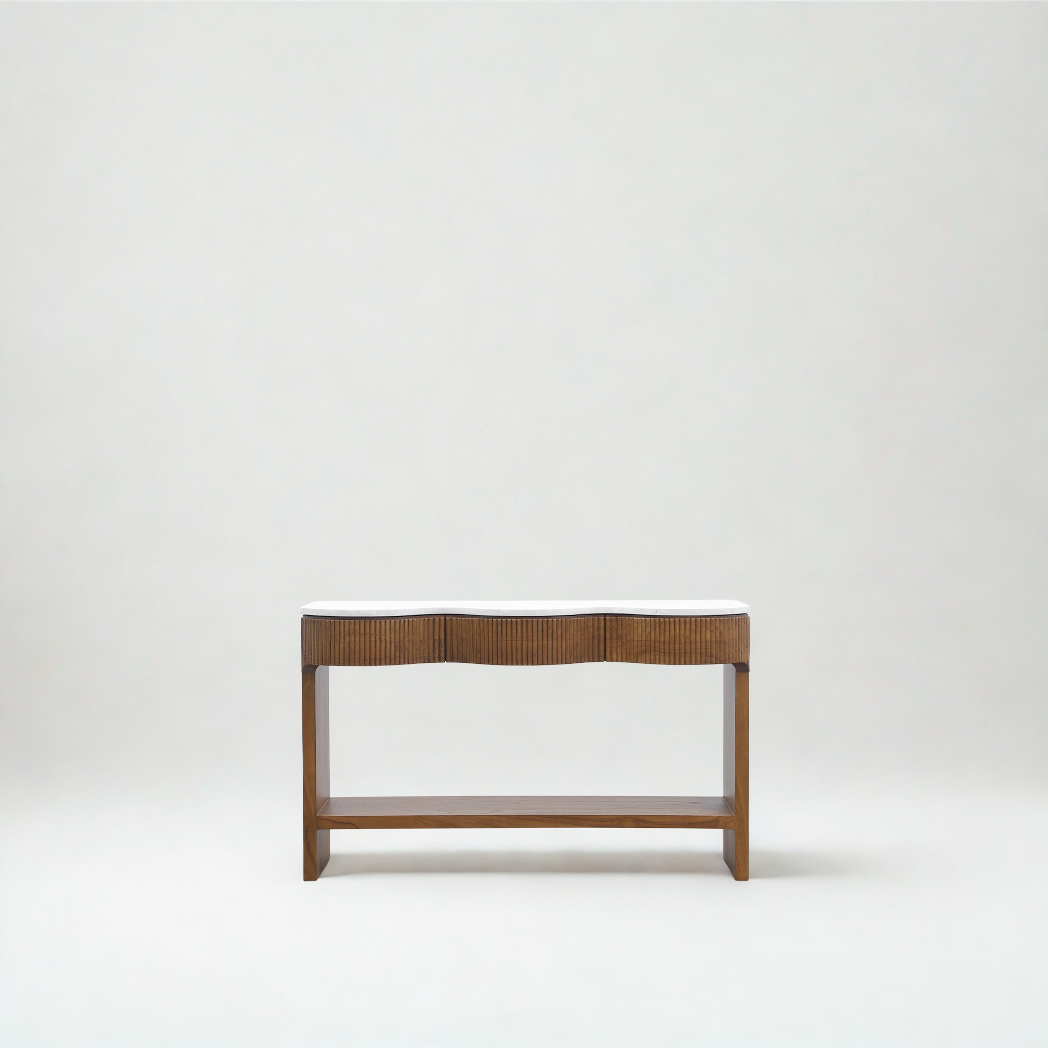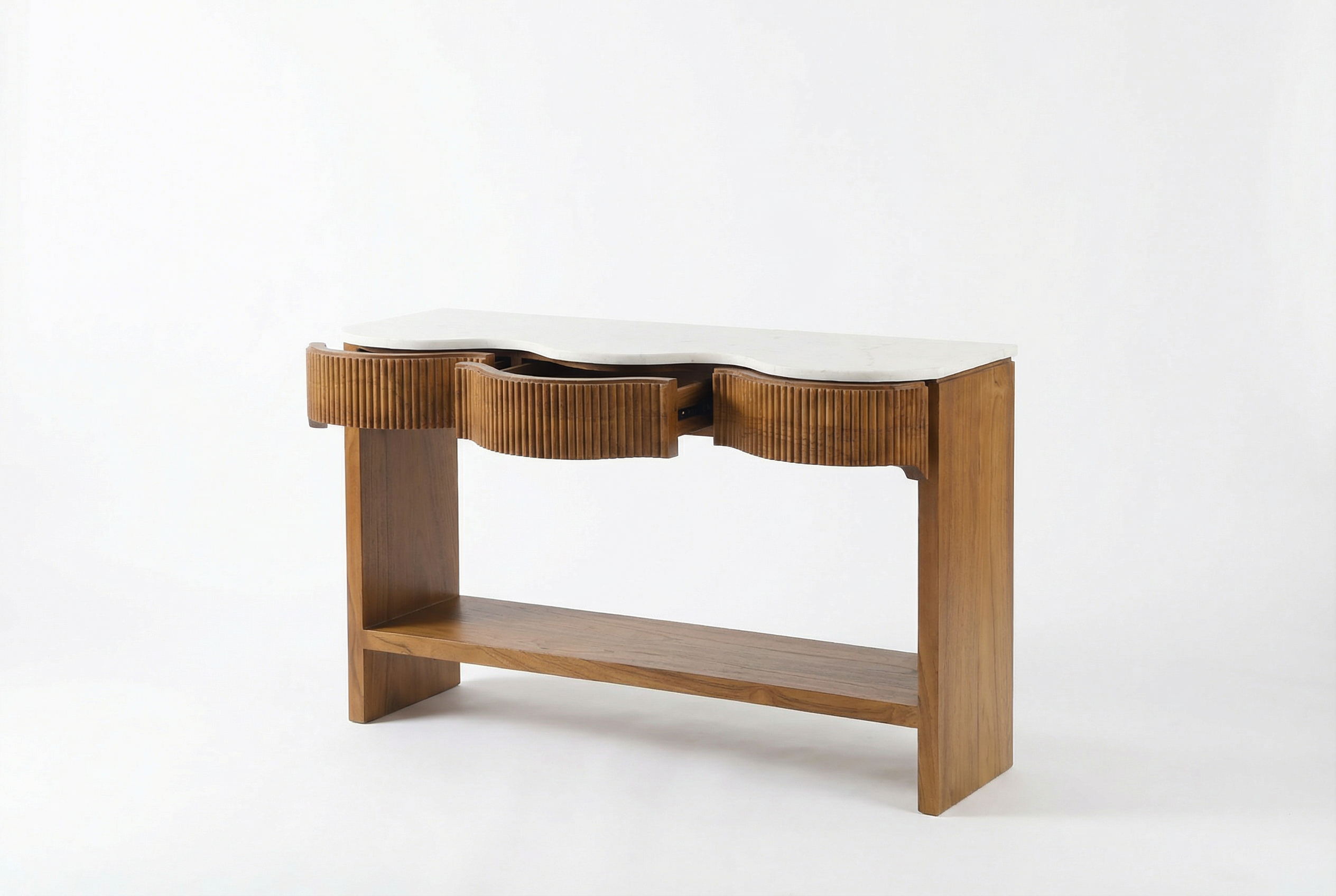 Three soft close drawers with vertical grooves offer both visual rhythm and practical storage, while the warm teak grain and soft veining of the marble highlight the beauty of natural, organic materials. Every detail—from the sculpted front to the minimalist legs—reflects thoughtful craftsmanship and enduring style.