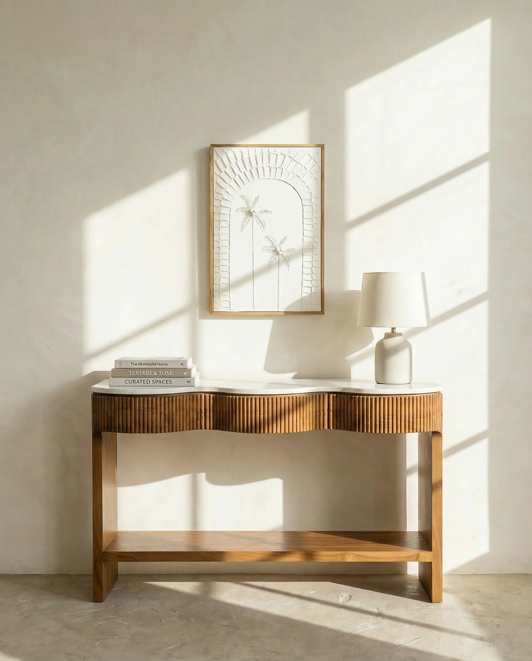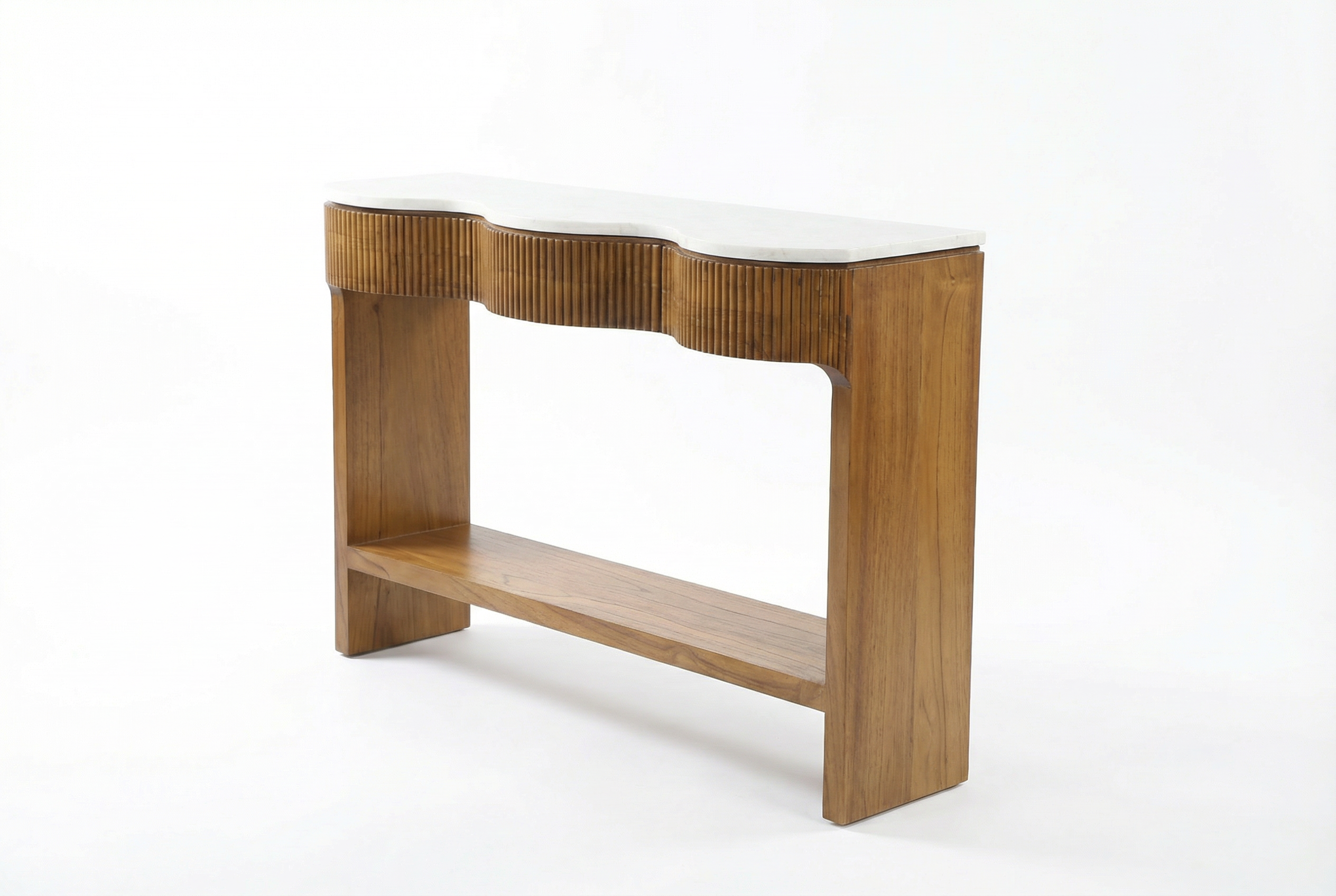 Crafted in a small, artisan workshop in Java, this solid teak wood console table is a celebration of curated design and understated luxury. Its elegant wavy silhouette flows seamlessly into a creamy marble countertop, creating a harmonious blend where organic forms meet timeless textures.