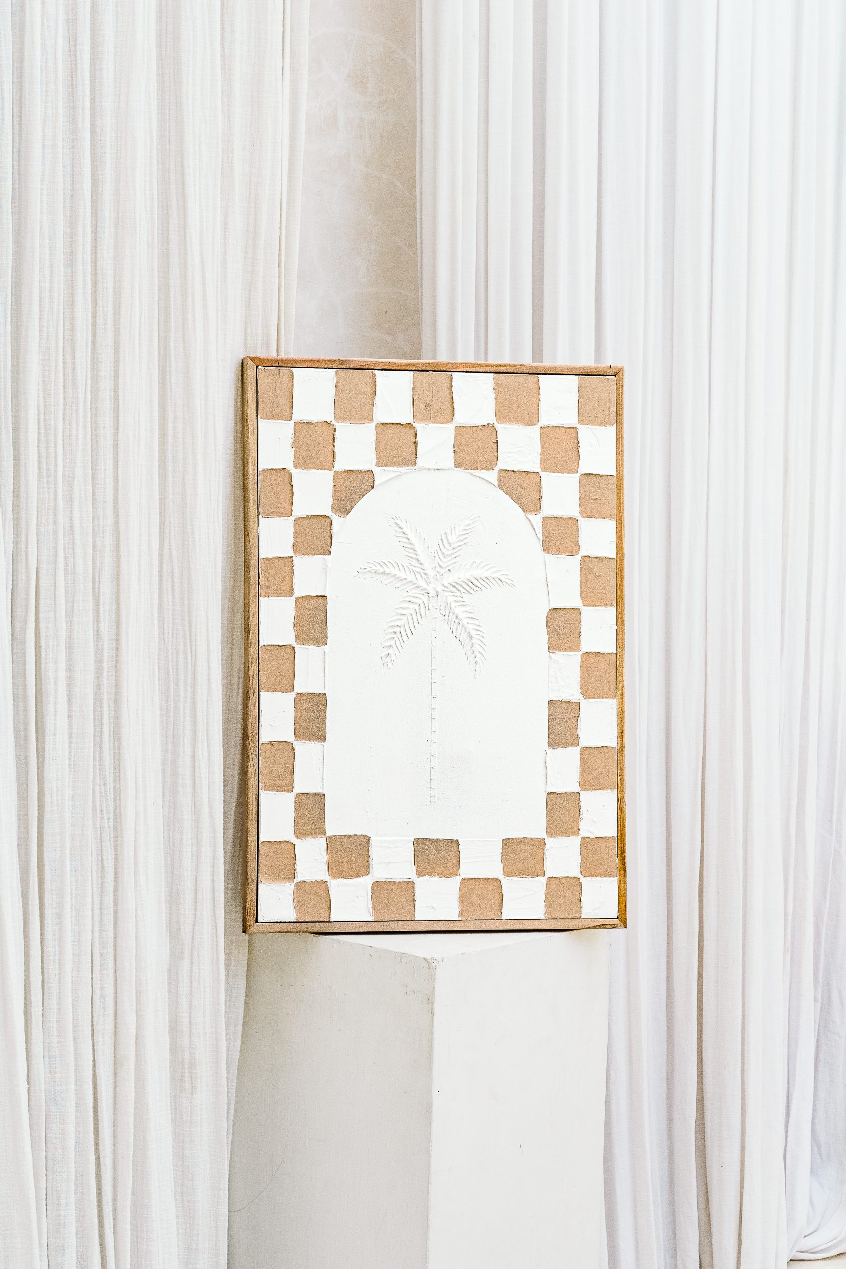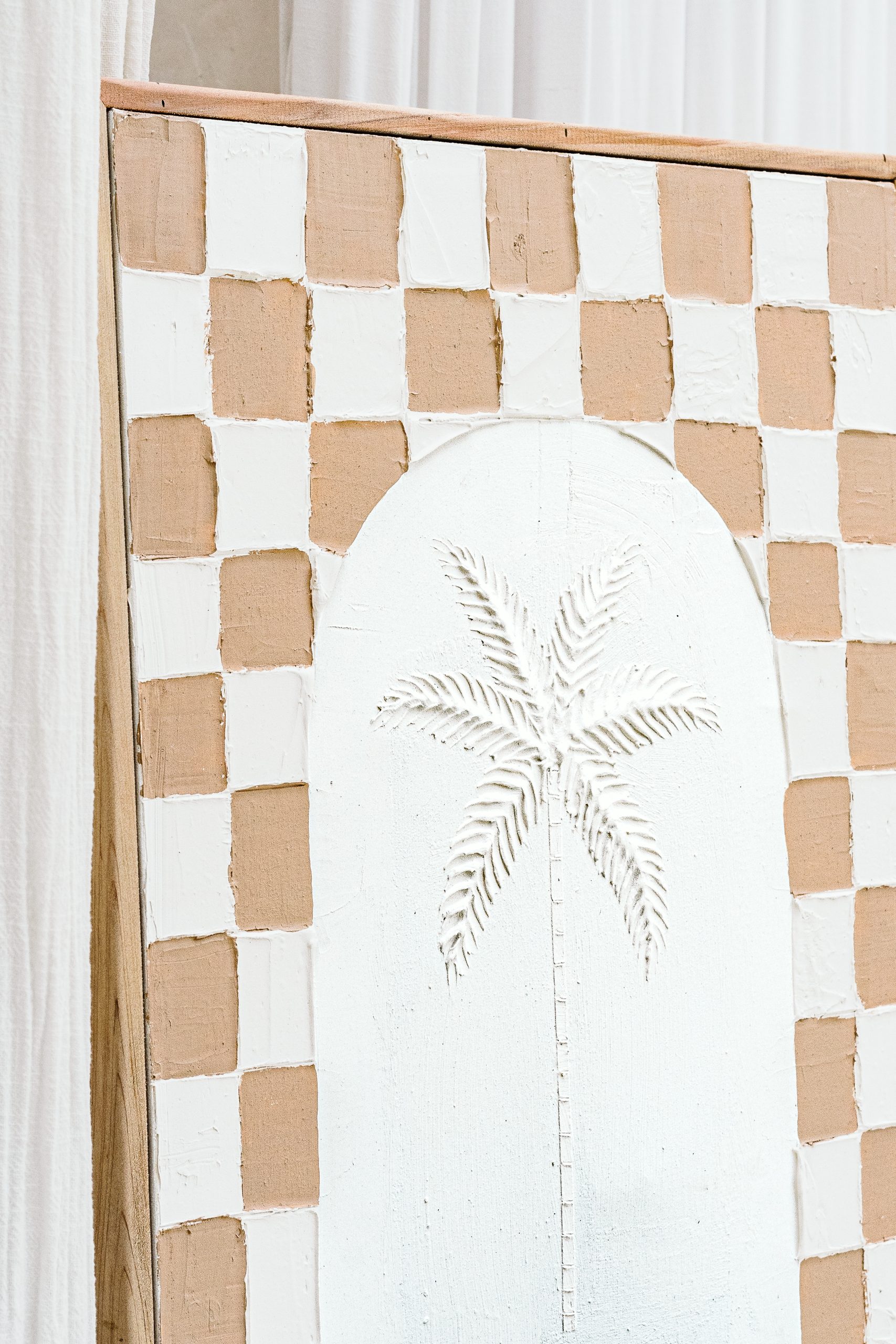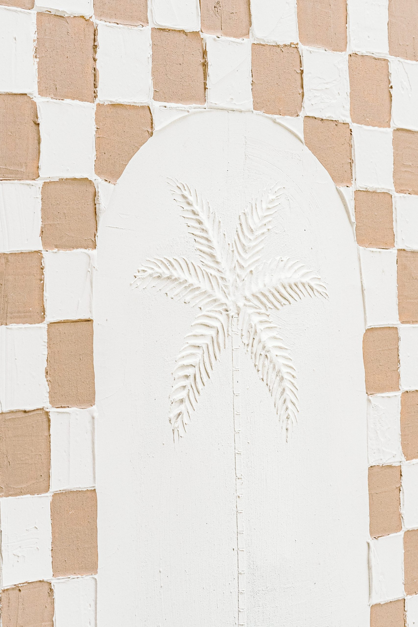 This elegant design features a delicate palm tree relief set within a soft architectural arch, framed by a textured checker pattern that adds depth and visual interest. The combination of natural plaster textures and warm earthy tones creates a refined yet organic look that complements a variety of interiors.